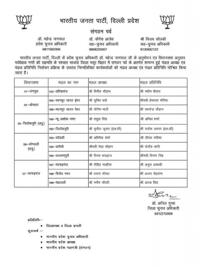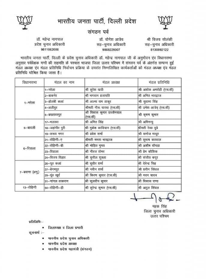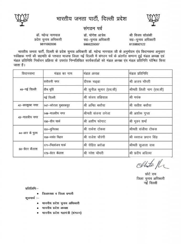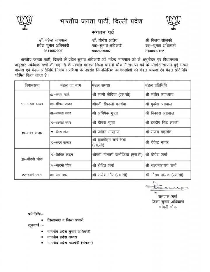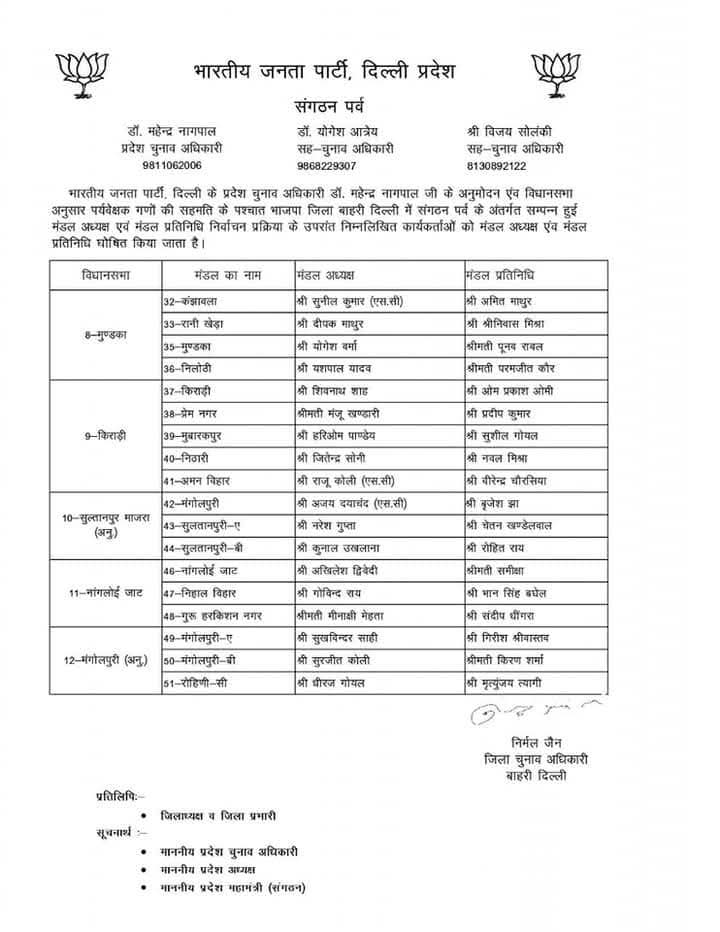 भारतीय जनता पार्टी दिल्ली प्रदेश के संगठन पर्व के अंतर्गत चल रही सांगठनिक नियुक्तियों की प्रक्रिया के तहत प्रदेश चुनाव अधिकारी डॉ. महेन्द्र नागपाल द्वारा विभिन्न जिला अध्यक्षों के चुनाव के लिए जिला पर्यवेक्षकों की नियुक्ति की गई। इन पर्यवेक्षकों की सहमति से मंडल अध्यक्षों और मंडल प्रतिनिधियों की घोषणा की गई।