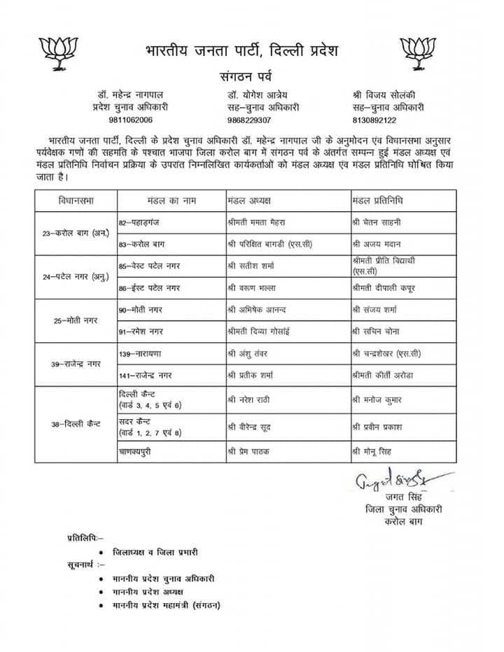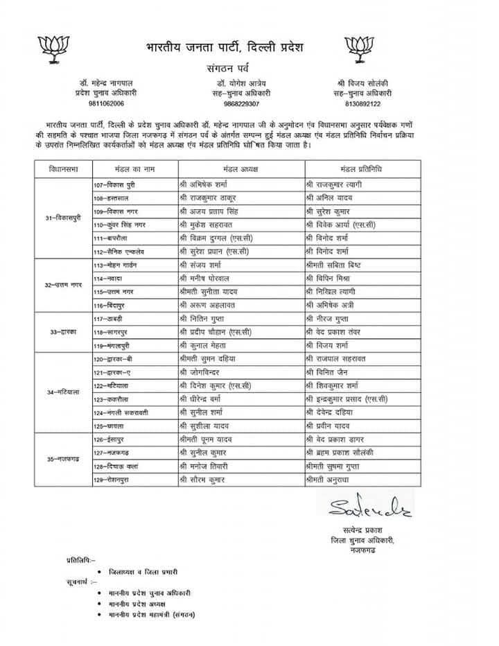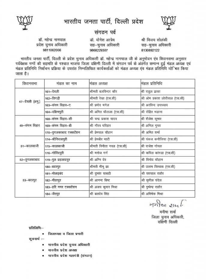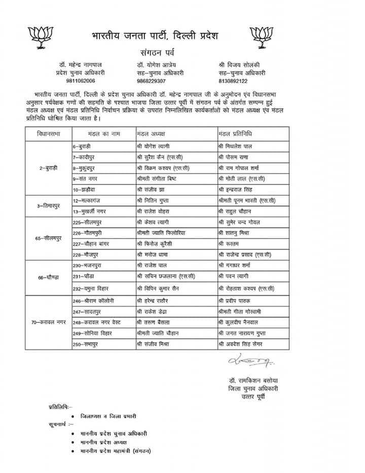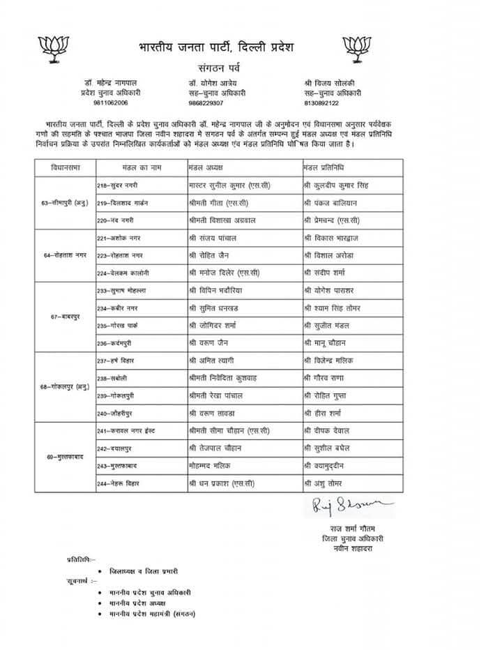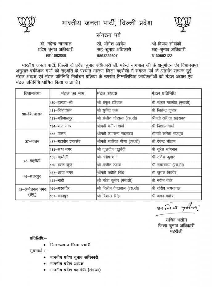 भारतीय जनता पार्टी दिल्ली प्रदेश के संगठन पर्व के अंतर्गत चल रही सांगठनिक नियुक्तियों की प्रक्रिया के तहत प्रदेश चुनाव अधिकारी डॉ. महेन्द्र नागपाल द्वारा विभिन्न जिला अध्यक्षों के चुनाव के लिए जिला पर्यवेक्षकों की नियुक्ति की गई। इन पर्यवेक्षकों की सहमति से मंडल अध्यक्षों और मंडल प्रतिनिधियों की घोषणा की गई।